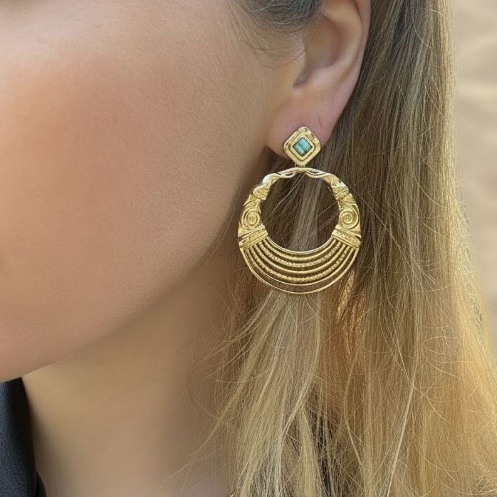 Deze stainless steel gouden oorbellen hebben een mooie turquoise steen als knopje en een opvallende hanger. De turquoise is echte natuursteen, dus elke steen is net iets anders. Dat maakt ieder paar uniek.