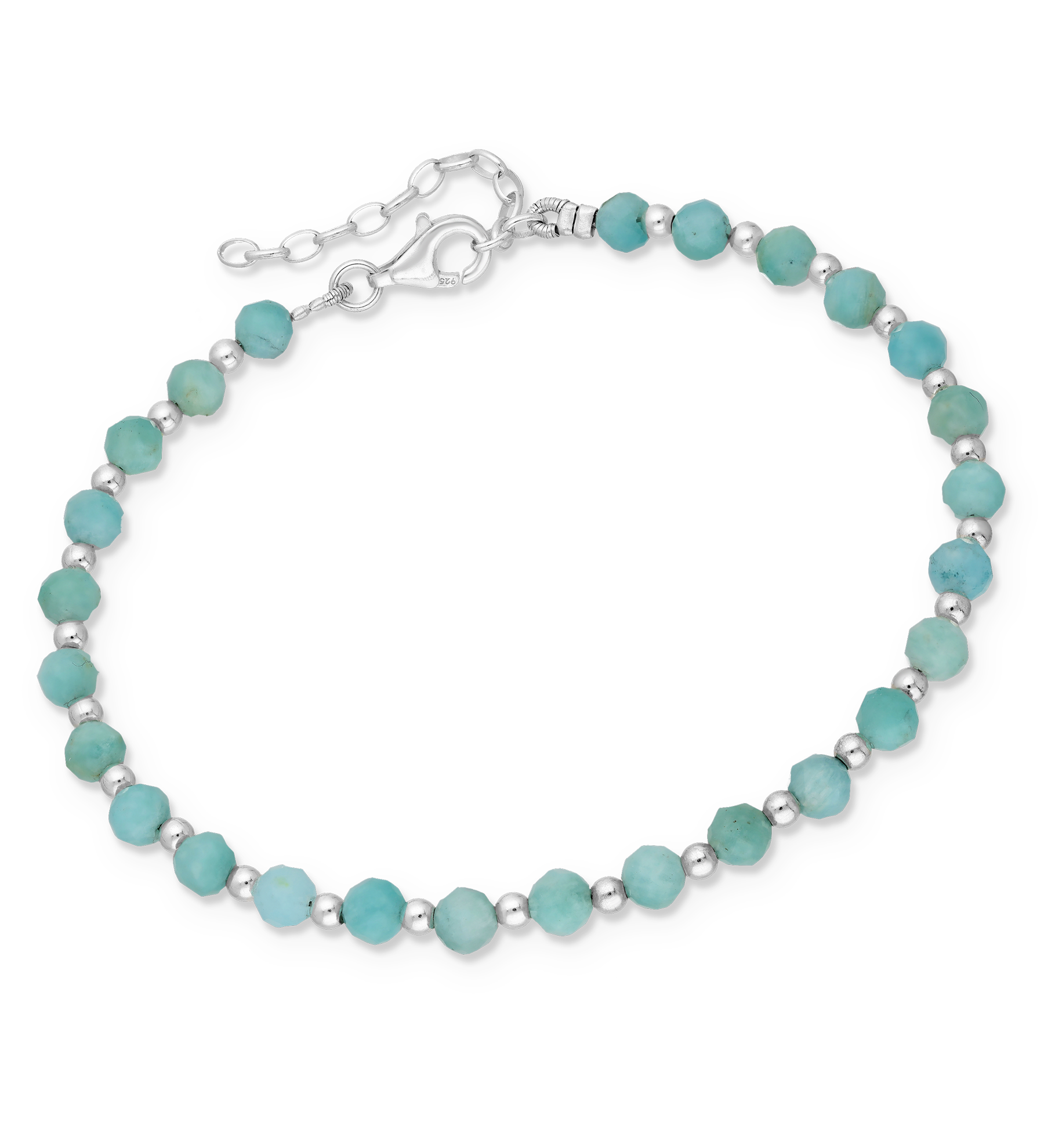 Prachtige kralen armband met amazoniet edelsteentjes. Mooi mintgroen. Door de afwisseling met de zilveren balletjes krijgt de armband een exclusieve en hele frisse look. Deze zilveren armband heeft een verlengkettinkje, dus op jouw gewenste maat te stellen.