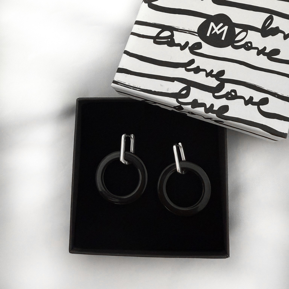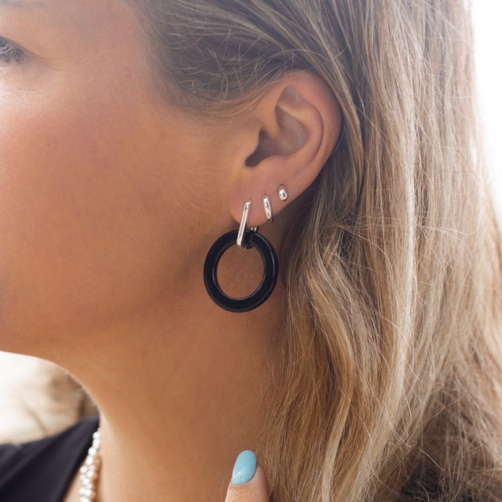 Deze statement oorbellen zijn gemaakt van zwart resin met mooie huggie hoekige oorringen. Het strakke design en de opvallende ronde vorm maken ze de perfecte eyecatcher voor elke look.