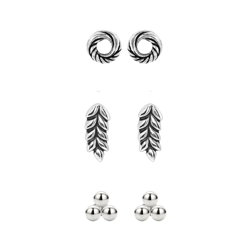 De gedraaide studs, het verfijnde bladmotief en de minimal bol oorbellen vormen samen een speelse maar stijlvolle ear stack.