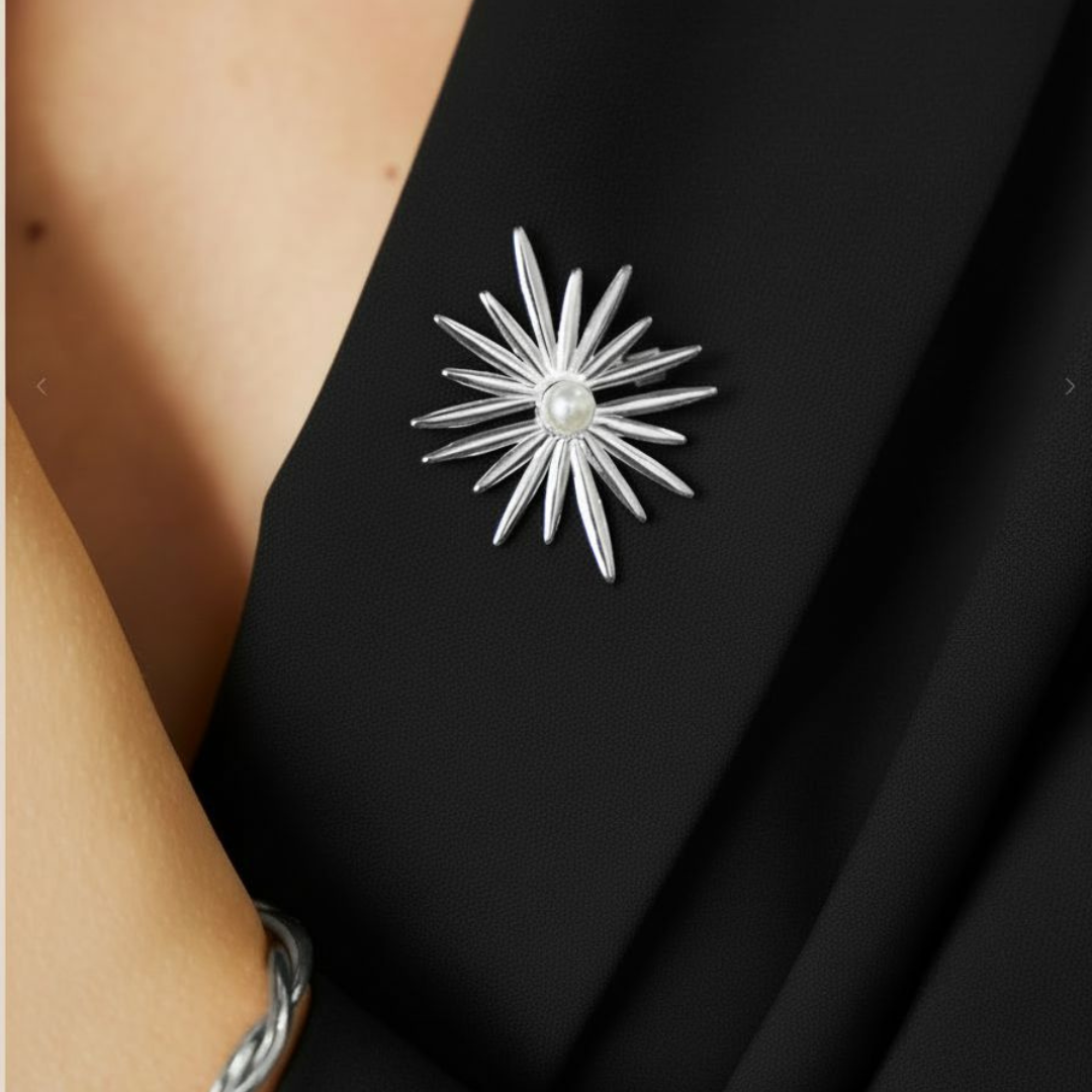 De Broche Sanura is echt zo’n item waar je meteen blij van wordt. Simpel, maar toch net even anders. De vorm doet een beetje denken aan een zonnetje of bloem, met in het midden een mooi pareltje dat het helemaal afmaakt. Perfect om je outfit net wat leuker te maken, zonder dat het “te veel” wordt.