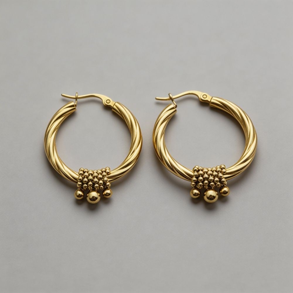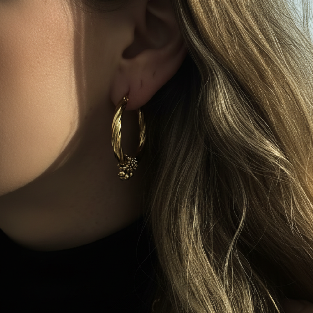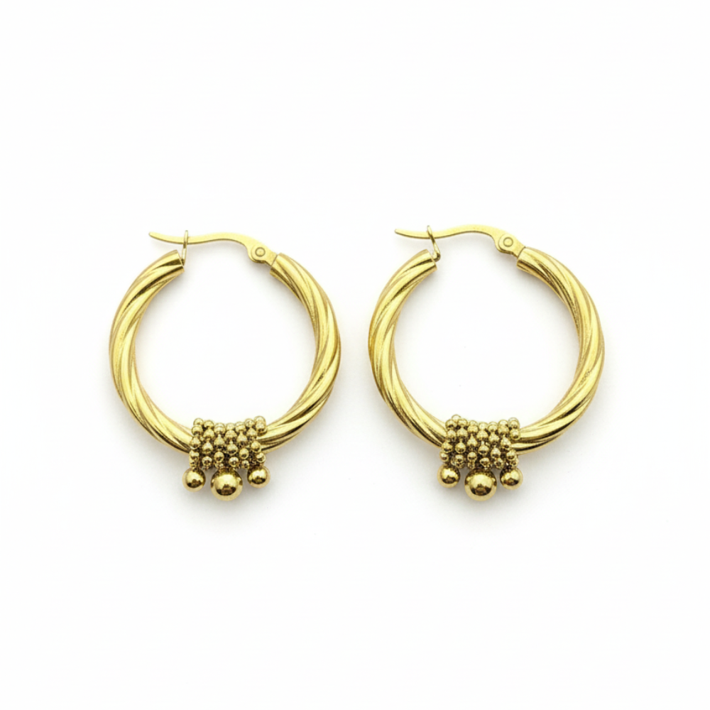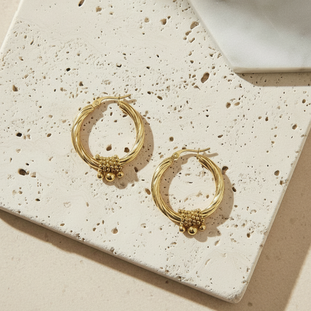 Calista oorbellen. Deze gouden hoops hebben een gedraaide ring met onderaan een speels bolletjes detail. Dat kleine accent geeft de oorbellen nét wat extra’s zonder dat ze te druk worden.