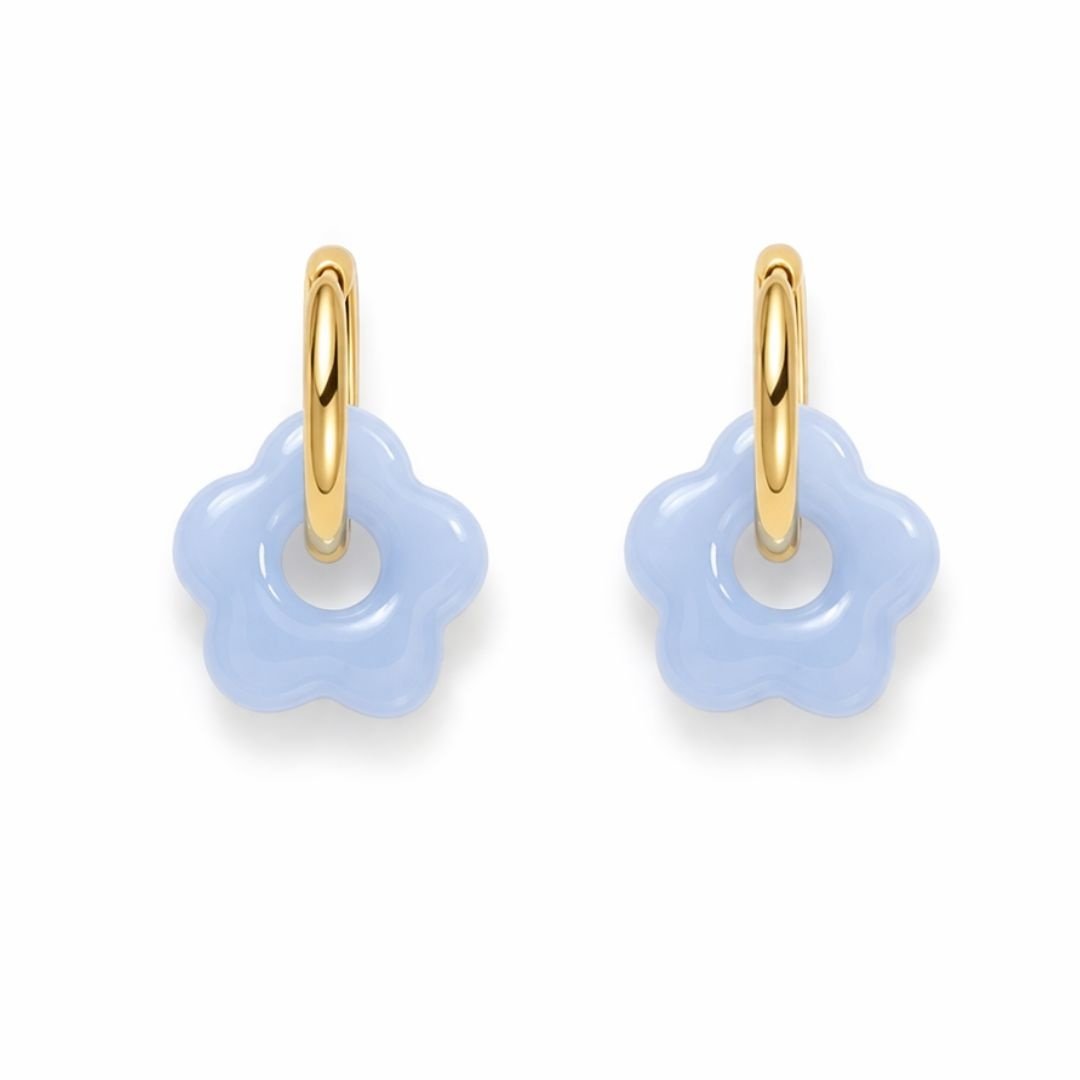 Vrolijk, kleurrijk en precies het soort sieraad waar je blij van wordt. Deze blauwe bloemetjes hangen aan een goudkleurige hoopring van 20mm. Samen zijn ze een combinatie die meteen opvalt.