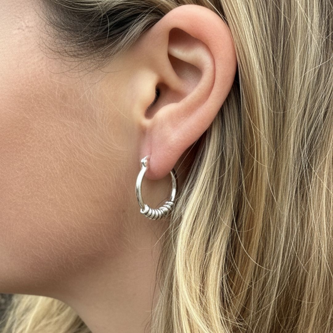 Prachtige oorringen met ringetjes onderin. Super stijlvol, stoer en vrouwelijk tegelijk. Je klikt de oorbellen makkelijk dicht. Het zijn oorringen die je mooi alleen kunt dragen, maar ook heel geschikt zijn om in verschillende combinaties te dragen voor een unieke earcandy. Natuurlijk echt zilver.