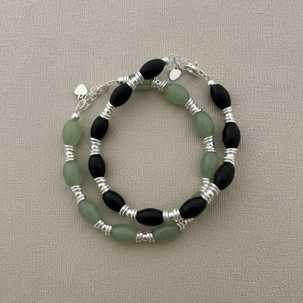 Deze armband is gemaakt van groene aventurijn, afgewisseld met zilverkleurige spacers voor een verfijnde boho look. Aventurijn staat bekend als de steen van rust, geluk en balans. Perfect voor wie een positieve flow wil ondersteunen in het dagelijks leven. De zachte groene tint past perfect bij zowel neutrale als kleurrijke outfits en sieraden combinaties.