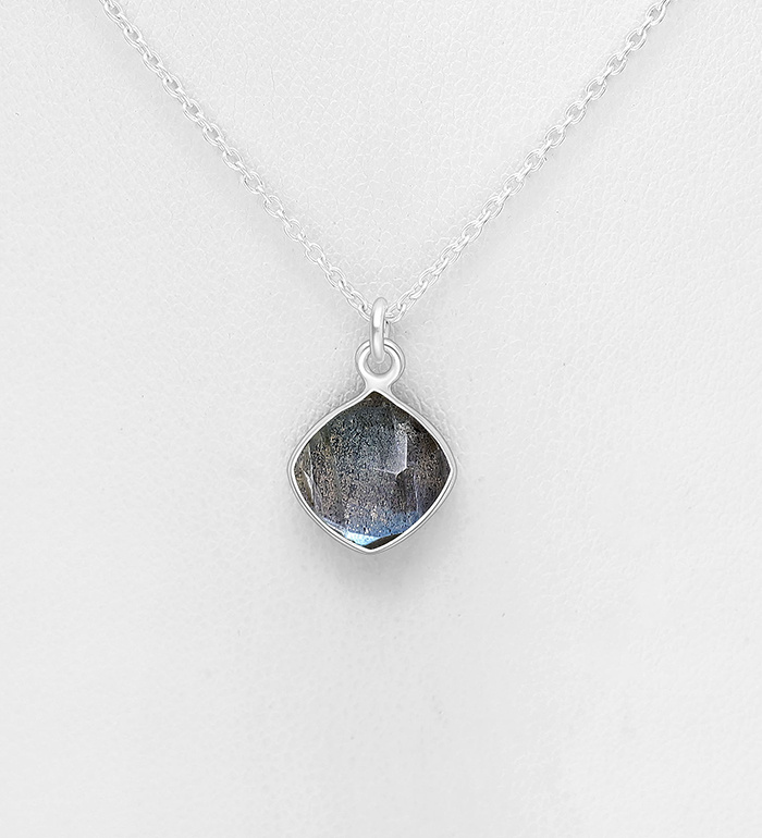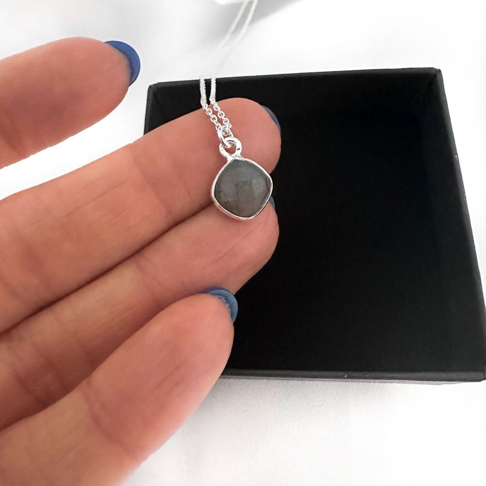 Zie hier onze prachtige labradoriet ketting met een elegante ruitvormige hanger. De mooie blauwe (verandert in het licht) labradoriet edelsteen staat bekend om zijn beschermende en balancerende eigenschappen, perfect om innerlijke rust te bevorderen. Gemaakt van echt zilver voor een tijdloze uitstraling.