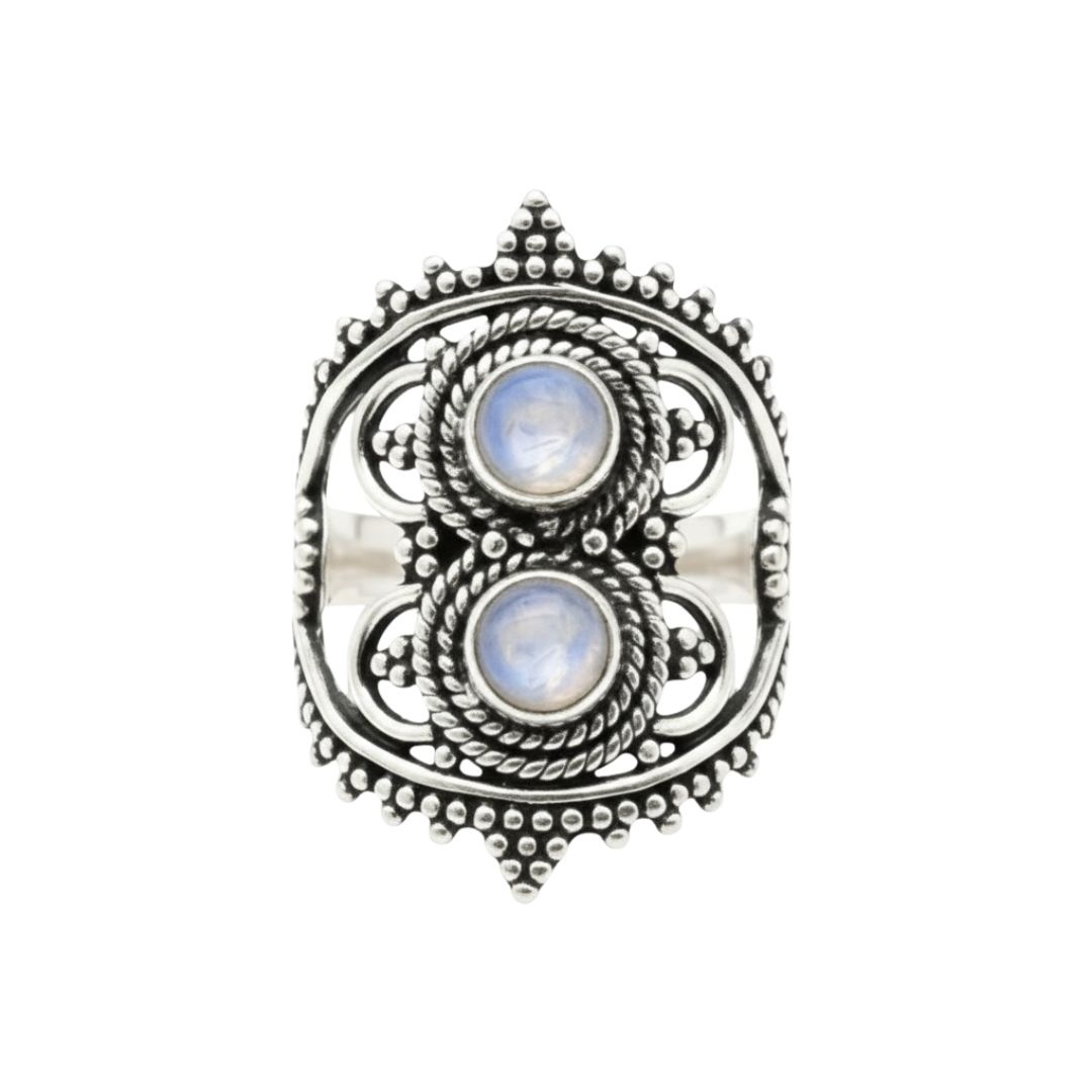 De ring heeft een prachtig design! Met deze ring maak je zeker een statement. De ring is van 925 zilver met edelsteen maansteen.