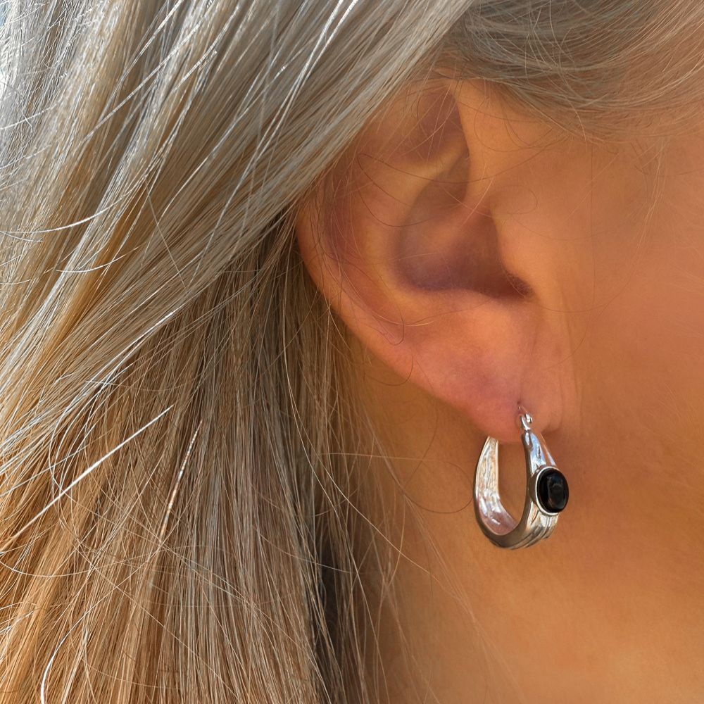 Deze bijzondere oorringen zijn gemaakt van 925 sterling zilver en afgewerkt met een gladde zwarte agaat. Het gewelfde ontwerp geeft de oorbel een organische, handgemaakte uitstraling. Elegant met een stoer randje.
