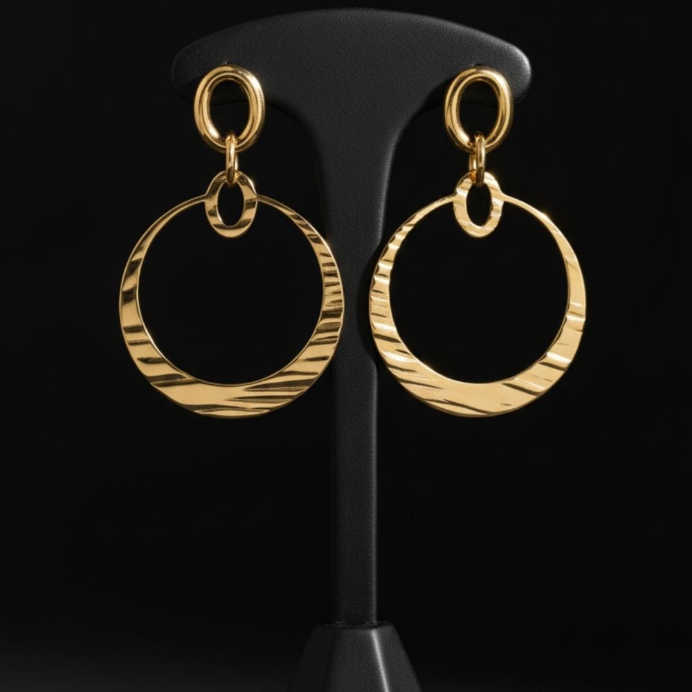 Radiance oorbellen. Deze gouden stainless steel oorbellen hebben een stoer en speels design met meerdere ringen en een ronde hanger. Door de subtiele structuur in het goud krijgen ze net wat extra karakter.