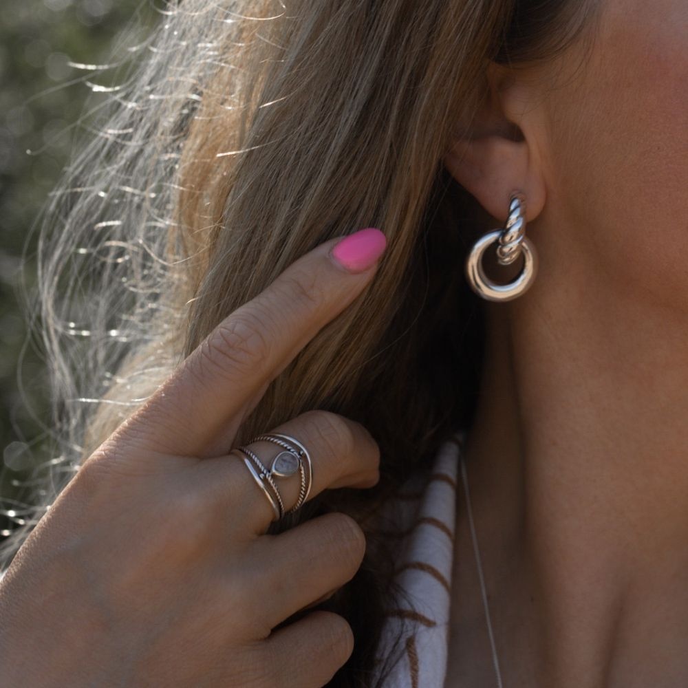 Een echte statement ring met karakter. Mira is grover van vorm, maar toch vrouwelijk. De maansteen in het midden vangt het licht op een subtiele manier en geeft de ring een eigen, rustige energie. Draag haar als blikvanger of juist als tegenhanger bij andere ringen. Boho met inhoud.
