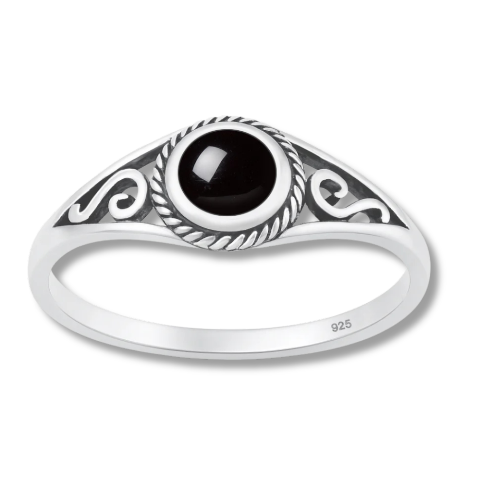 Deze mooie zilveren ring met zwarte onyx edelsteen is een unieke ring De ronde onyx wordt omringd door subtiele gedraaide details en zachte boho details,Een tijdloos ontwerp dat je prachtig solo kunt dragen, maar ook heel mooi kunt combineren met andere ringen.