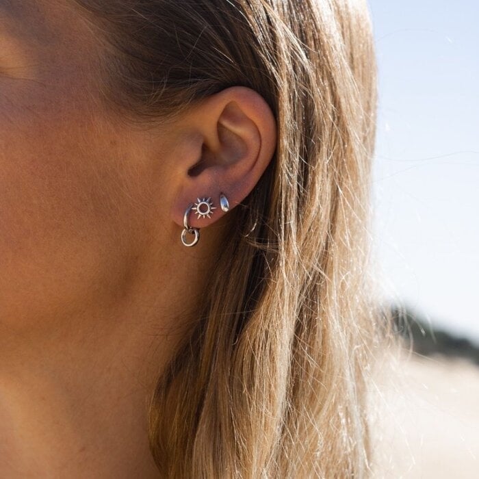 De subtiele hoops met ring, de speelse zon studs en de gladde druppel oorbellen vormen samen een stijlvolle ear stack met karakter.