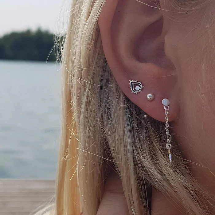 Deze mooie set bestaat uit subtiele hugging oorringen met bolletje en elegante boho knopjes in druppelvorm. Ideaal voor in het tweede en derde gaatje.